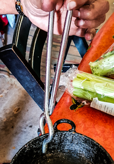 The sandasi’s long handles also mean that the user’s hands can be kept at a safe distance from the hot cooking vessels that are lifted with this pair of tongs. For example, the tea maker can lift and manipulate with ease the huge pots containing several litres of a bubbling, boiling mixture of milk, tea, and spices.