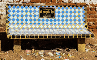 All over Gujarat, in villages and towns and in between, I have seen concrete benches whose surfaces are covered with ceramic tiles or selected flat fragments of broken ceramic plates.