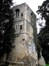 We walked past a vast field in which some grassy crop was growing. Far across the field there was a small wood. A church tower could be seen rising from amongst the trees. We followed another path towards the clump of trees and soon arrived at the tower. This tower and a graveyard is all that remains of the church of St Mary and All Saints (some call it ‘All Hallows and Little St. Mary’ and others ‘Thundridge Old Church’), which was demolished (apart from the tower) in 1853, when a new church was built in Wadesmill. The tower was constructed of flint and mortar in the 15th century. The rest of the church, now demolished, was built in the 11th to 12th centuries. A Romanesque archway now set into the eastern wall of the tower is the only visible remains of that former church. Although this ruined tower might well appeal to those who find ruins romantic, it is in a bad condition with some of the structure covered with corrugated iron sheeting and other parts with graffiti. There are some plans to conserve it and others to demolish it to make room for new housing.