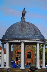 The market cross in Swaffham, Norfolk, is in the form of a circular shelter topped with a lead covered dome supported by eight plain columns with Doric capitals. The dome is surmounted by a statue of the Roman goddess of corn and agriculture, Ceres. She is depicted holding in her left hand a cornucopia filled with vegetables, and in her right a bundle of heads of corn. This market cross with its statue that harks back to pre-Christian religion does not contain or otherwise display the cross associated with Christianity.