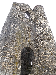Ore that was brought to the surface was taken from the tower and moved to an ore crushing facility across the B3311. It was transported across the road by an overhead tramway, which has long since been removed. The tower, whose arches reminded me of Romanesque buildings can be entered. When I visited it, there was a spooky sound echoing within it. Looking upwards towards the open sky that can be seen because the tower has lost its roof I saw that it was being created by a solitary crow perched high up on one of the walls.