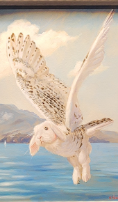 The portraits are not on display at the NGMA. Instead, there are about 40 of his well-executed paintings. Each of them is painted in a classical style that cannot be described as adventurous. However, most of the paintings contain whimsical or Surrealist elements. Some of the works contain Indian subject matter. The paintings are displayed in a large room onto whose walls and ceilings video images are projected.