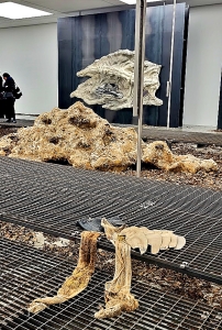 One room of the gallery is occupied by tall sculpture made with knotted natural fibres. Its base is a collection of thick serpent-like fibre ropes that spread across the floor like the roots of a tree. Attached to this structure, there is something that resembles an enlarged seashell which contains an image that includes depictions of fingertips. This inclusion reminded me of the appearance of mitochondria when viewed with an electron microscope. Although I find it difficult to describe this artwork in words, what can be seen in the far larger gallery next door is almost indescribable.