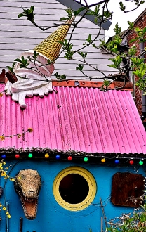 We walked across the bridge, and along the island’s single winding footpath. On our way we passed houses and gardens, many of which have been decorated in humorously picturesque ways. At the end of the path, there is a red painted metal door, through which we passed, and entered a large covered boat repair workshop. Beyond that, there is an amazing collection of wackily decorated shacks and sheds, in which artists have studios. There is also a modern block of flats, which looks too conventional for its eccentric surroundings, and a far cry from the alternative atmosphere that prevails on the rest of the island.