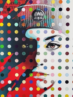 This exhibition displays works by Damien Hirst and two famous street artists: the American (USA) Shephard Fairey and Invader, a French person. Both street artists, each of whom was trained at an art school, began their street art careers with a single work: Invader in Paris with a pixellated depiction of a Space Invader, and Fairey with a sticker, the forerunner of his “Obey” posters. Street art is what some people might describe as unwanted graffiti, and others as public art. In a press release, Damien Hirst said that what he likes about these two artists is: