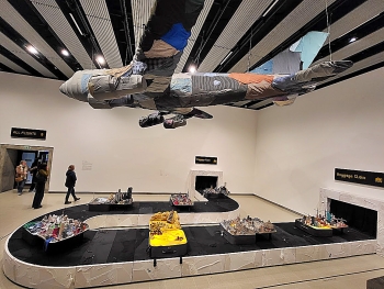 One of the immersive installations on display is “International Flight”, which incorporates examples of her “Portable City” series. The Portable Cities are open suitcases in which there are models of city centres, including those of many places in China and one of London.  On entering the first gallery of the Hayward through a door marked “All flights”, one can see a model of a passenger jet plane made of cloth, suspended from the ceiling. Below it, at floor level, there is a life-size model of a baggage claim conveyor belt, on which several examples of Portable Cities are displayed. Near the conveyor belt, there are three seats of the kind usually found in the departure lounges of airports and a few baggage trolleys on whose handles are the words: “Press Down to Release the Brake”. The installation is not only visually fascinating and somewhat humorous, but also a creative portrayal of globalism.
