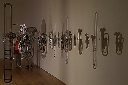 In another room, there was an installation, which also made effective use of reflections projected on to its walls. “Perpetual Canon” consists of a collection of silvered brass instruments, which have been flattened. Each of them is suspended from the ceiling by a fine thread, and they are arranged in a circle which surrounds a centrally located light. The light throws shadows of the instruments onto the four walls surrounding them. Like the two previously described works, this provides a very effective and intriguing visual experience.