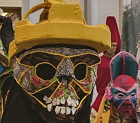 “The Procession” consists of a large number of models of people dressed in colourful and fantastical costumes. They are arranged as if they are taking part in a carnival or parade. Many of the models appear slightly grotesque or even menacing. If these models were real people, they would inspire awe and maybe fear. Some of them carry banners, others carry skulls, and there are some supporting poles from which objects are either suspended, or on which objects are supported.