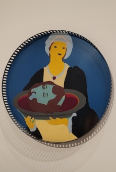 I will not attempt to discuss all the works on display at the Barbican, but will confine myself to her paintings on items of furniture, which she commenced in the 1970s. These beautifully executed creations are often quite witty. “The Last Supper” was one of the first of these pieces of furniture repurposed as a work of art. It consists of a fine table on the top of which the artist has painted a simplified version of a renaissance depiction of the Last Supper. And on a wooden coat stand, the mirror has been painted over with Gonzalez’s simplified version of the famous Mona Lisa painting. Another example is a straw basket with a ribbon on its handle. On the inside of the base of this everyday object she has painted a picture of three puppies resting on a floor. There is also a metal cot whose base is painted with a picture of a sleeping child. In the show, there are some televisions with paintings of people covering their screens. By now, you must be getting the idea of this aspect of Gonzalez’s art. My favourite example of this re-use of household items as places to paint pictures is a circular tray on which the artist has depicted Salome carrying the severed head of St John the Baptist on a circular tray.
