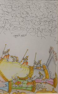 Raghupati Bhat’s drawings and paintings depict mythological stories from the Ramayana. All of them are exquisitely executed and filled with minute details. A set of four painted miniatures are painted with dyes made from natural products, using single hairs from paint brushes to achieve the great detailing within them. In many of his line drawings, Bhat included delicate, beautiful ‘doodles’ in addition to the pictures’ main subjects. All in all, the exhibition includes a fine selection of the artist’s intricately executed creative interpretations of episodes and characters in the Ramayana.