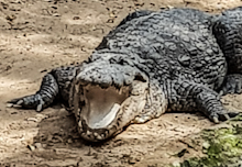 THE CROCODILE LYING LAZILY in the hot sunshine with its teeth lined jaws wide open lay motionless as we and many other visitors gaped at it with amazement.