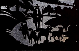Panels on the walls of the café and around the north entrance to the park are decorated with scenes from the history of the area in the form of silhouettes. Some of them show animals being driven through the countryside. Others depict market scenes and the shops in which the meat was sold. Circular panels mounted on the walls of the tower show old photographs of the market in its heyday.