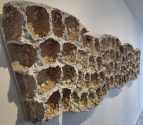 The largest room of the show must be seen to believed. Entering is like setting foot on an alien planet inhabited by weird organic shapes that suggested to me plants, fungi, and insects, but all of them greatly magnified. These shapes are sculptures created by Humeau. Some of them were emitting musical sounds. I found the sculptures both intriguing because of their allusions to biological structures and also quite satisfying visually. As to what led to their creation, the gallery’s website (https://whitecube.com/artists/artist/Marguerite_Humeau) explained: “The artist was inspired by eusocial insects such as ants, termites and bees, whose complex cooperative societies enable them to build huge structures and to cultivate other organisms in symbiotic relationships. Reflecting on the ants shepherding their aphids and the termites tending their fungus gardens, Humeau found an equivalent in the place yeast has assumed in human societies, as the essential ingredient of bread and beer around which our human collective has gathered. Contemplating the probability of our imminent, self-inflicted extinction as a species, Humeau sees insect societies as both the inheritors of our ravaged environment, and a prompt to consider how interdependence and cooperation might offer a means to avert our fate.” Fair enough; but even if the works are portents of a gloomy future, my spirits were uplifted by seeing them. The exhibition continues until the 14th of May 2023. If you plan to visit it, save a bit of time for the interesting and attractive, abstract paintings and sculptures by Samuel Ross (born 1991 in London), which are on show in another of the gallery’s spaces.