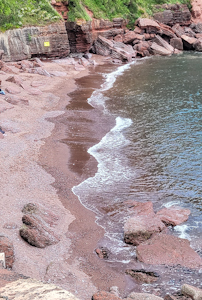 We followed signs to the Café Rio, which is reached down a winding staircase that clings to the slopes of a hillside overlooking a secluded cove surrounded by striated red rocks. The hillside is covered with luxuriant vegetation. The café is on a terrace above a small beach, where intrepid swimmers were enjoying the sea. We ate a light lunch on this terrace, and enjoyed the view.