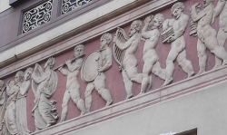 THE EYES OF MOST VISITORS to Kensington Gore are attracted to the spectacular Royal Albert Hall and, opposite it, the monument to Albert, Queen Victoria’s consort. Immediately to the west of the Royal Albert Hall, there stands the comparatively less impressive twentieth century building housing the Royal College of Art (‘RCA’), designed by H T Cadbury Brown and opened in 1962. Next to this geometric structure of concrete and glass and on its south side, there is an edifice whose appearance is a dramatic contrast to it. The walls of the RCA’s southern neighbour are covered with figurative illustrations, created in the ‘sgraffito’ technique. Bands of ‘putti’ carrying musical instruments, scrolls of paper, or singing, appear to be scurrying across the walls of the building. Maybe this is not surprising because once this place housed The Royal College of Organists (‘RCO’).