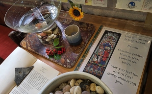 At St Winnow in Cornwall, we noticed something quite different. A bowl filled with water was standing on a table next to a bowl filled with pebbles. Those wishing to make a prayer, are invited to take one of the stones and place it into the water, instead of lighting a candle. We were told by someone working in the church that the stone dropping is a Celtic Christian tradition. I have since read that it might also have been a pagan tradition.