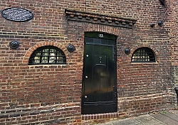 Steeply sloping, narrow Cannon Lane runs alongside the eastern wall of the grounds of Cannon Hall. About halfway down it (between Squires Mount and Well Road), there is a doorway in the wall. There is one semi-circular window on each side of it. Each of the windows is behind a lattice of metal bars. A plaque nearby informs the viewer that this was once a parish lock-up in which prisoners were held temporarily in a dark cell. The lock-up was established in about 1730. In that era, magistrates held court proceedings in Cannon Hall. In 1829, when a police force was set up in Hampstead, court business and prisoners were held in the Watch House on Holly Walk.