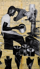 Many of the works use recycled waste materials such as bits of paper, engine parts, spent bullets and retired armaments, electronic components, and so on. Almost every art work is a fine aesthetic object when seen as a whole. Looking into any of these works in detail is like beginning to explore Africa, its troubled past and challenging present.