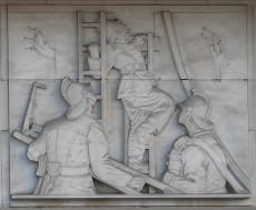 Overlooked by London’s recently constructed, glass-clad Shard, is short Cottons Lane that leads north from Tooley Street. Where these two roads meet, there is a sculptural plaque high up on a wall. It depicts a wreath entwined with a firefighting hose pipe. Behind the wreath, the artist carved the façade of a building with smoke billowing out of its windows. There also depictions of other tools used to fight fires in the 1860s when this memorial was constructed. Within the wreath. there are words:
