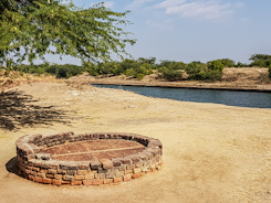 The ruins are, as already mentioned, mostly made of brick. A low mound, known as the ‘Acropolis’, is covered with structures that might have been warehouses or residences of the upper echelons of Lothal. The mound overlooks what looks like a huge rectangular brick lined swimming pool, now filled with rainwater. When Lothal was thriving, this dock was connected to the nearby sea (now the Gulf of Khambat) by a channel along which vessels could sail. Over the millennia, the coastline has shifted and what was once Lothal is separated from the sea, far away from it. The ASI keep the dock filled with rainwater to show what the dock must have looked like in its heyday.