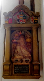While looking around Swaffham’s Church of St Peter and St Paul, which was built in 1454 in the Early English gothic style, we came across an interesting funerary monument in a chapel on the south side of the building. The monument contains a sculpture of a woman on her knees with the left side of her face in profile and looking to the left. This monument, covered with heraldic crests, is a memorial to Catherine Stewart, only child and sole heir of Thomas Payne, formerly of Castleacre (Norfolk). Catherine Stewart, who died in 1590, was the second wife of the tithe farmer (a kind of tax collector) William Stewart of Ely, who was buried in Ely Cathedral in 1593.