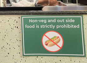 ‘Outside food‘ is food not sold by the stall. You must not bring food you have obtained elsewhere. This coffee stall only sells vegetarian products.