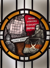 “I designed the window to give the appearance of a traditional pub but with a twist. The window utilises some of the colours and elements of the sub continent and tells the story of the punjabi community who migrated to the area in the 50’s. It also celebrates the establishment of the Indian workers association by Avtar Singh Jouhl and the visit of Malcolm X at their invitation.”