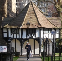 The half-timbered octagonal hut in the middle of Soho Square looks as if it has been there since the late 17th century. At least, that is what I believed until I began writing this today. Described by the architectural historian Nikolaus Pevsner as “… a silly half-timbered summer house …”, it dates from 1875-76 and was probably built by SJ Thacker.