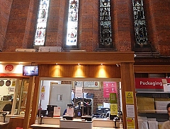 On entering the church through its electrically operated glass sliding doors, you will be surprised by what you find beneath its fine hammer beam timber ceiling. The west end of the nave is occupied by a post office, the first main-branch of a UK post office ever to be housed within a church. The north aisle of the church contains a children’s ‘soft play’ area, appropriately named ‘Hullabaloo’. The floor of the nave is filled with tables and chairs occupied by people of all ages, some enjoying refreshments from the church’s Sanctuary Café. All these things that you would not normally expect to find inside a church are part of The Sherriff Centre, a community organisation that began operating in 2014 (https://thesherriffcentre.co.uk/). The Centre’s activities also include a stationery store, a free food bank, live music as well as other events, free wi-fi, debt advice, and more.