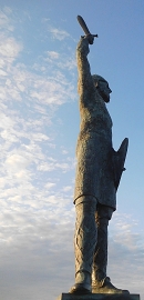 The statue overlooking the sea is a sculpture of Byrhtnoth, Ealdorman of Essex, an Anglo-Saxon aristocrat or high official, who lived during the reign of Ethelred the Unready (c996-1016). Byrthnoth died during the Battle of Maldon on the 11th of August 991. The battle was fought by the Anglo-Saxons against an army of Viking invaders. It is said that before the battle, the Vikings offered to sail away if they were paid with gold and silver. Byrhthnoth was recorded as replying that he would only pay the attackers with the tips of his men’s spears and the blades of their swords.