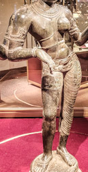 The statue I gave been describing is half male and half female. According to an information panel nearby, this sculpture is an 11th century depiction of Artanarishvara. It is a composite of Shiva (right half) and Parvati (left half). It represents the belief that the Godhead, Shiva, and his consort, Parvati, cannot exist without each other. It also shows that without the coexistence of male and female, human life cannot be propagated and continued. No doubt, there is much more meaning encompassed in this interesting sculpture, but I am not competent to discuss this further. Suffice it to say, seeing this unusual sculpture gave me food for thought.