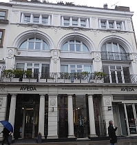 Further west along the Grove, well past the Planet Organic ‘wholefood’ store and Alounak, one of the Grove’s several Persian restaurants, we reach number 62-64, whose façade is almost as grand as that of Al Saqi. Unlike the latter, this building’s history is harder to ascertain. Currently, it is the premises of Aveda, a beauty salon also called Gina Conway Salon Spa. The ground floor façade of this edifice includes neoclassical columns with Doric capitals, and decorative mouldings, which include the letters ‘C’, ‘L’, and ‘M’. These are intertwined to form a logo. The first floor is fronted by three large arches separated by decorative mouldings and the top storey has three sets of windows set back behind lintels supported by short columns with Doric capitals. The salon, although modernised to suit its current purpose, has its original elaborately decorated moulded plaster ceiling and wall mouldings, some of which depict the heads of angels or putti. Nobody in the salon had any ideas about the history of this attractive building.