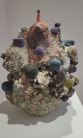 Yasunaga is part of an avant-garde group of Japanese artists, Sodeisha, which was formed after WW2. The movement rejected and challenged previous Japanese artistic traditions. It also introduced non-functional ceramic objects as an artform. The objects on display at the Lisson Gallery were created as follows. Yasunaga used glaze rather than clay as his starting material. Combining it with raw materials such as feldspar, whole rocks, metal and glass powders, he created artistic forms. Then, he buried the creations in layers of sand and kaolin, before subjecting the whole lot to heat in a high temperature kiln. After the firing and cooling, the sculptures were carefully excavated from the beds (of kaolin and sand) in which they were fired.