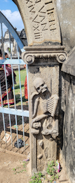 The Dutch cemetery is a fantastic sight. It is well worth making the 2 hour road trip from Chennai to see it. The entrance to the walled graveyard is made of carved stone. On each side, it is flanked by stone carvings of skeletons. One is resting its skull on its right hand and holding another in his left, and the other is balancing a double-sided drum or tabla on its skull. Although there are several obelisks and elaborate mausoleums in the cemetery, most of the graves are marked by horizontal stones upon which there are carved inscriptions. The inscriptions, which are all easy to read, are often framed with decorative floral carvings. Most of the inscriptions are in Dutch. A few are in Latin. The oldest of the deceased died in the mid to late 1650s. At the far end of the cemetery, we found two graves of British people. Although the British took over Pulicat in 1825, they used it more as a place for picnics than as a trading station.