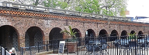 A covered arcade, open to the outside on one side, runs from where the southwest corner of the house used to stand, passing near the icehouse, to the southeast corner of the orangery. In poor weather, this long covered passageway was used by house guests moving between Holland House and its summer ballroom. From the western end of the passageway, they would have had to walk through the orangery to reach the ballroom. In fine weather, those attending balls would have walked along the walkway above the covered passage. In places, this runs past walls covered with colourful tiled panels, made in Florence (Italy), which were placed there in the 1850s. The wall of one stretch of the covered walkway, the section nearest to the orangery, are painted with scenes depicting an imaginary garden party held sometime in the 1870s. They were created between 1994 and 1995 by the artist Mao Wen Biao (born 1950).