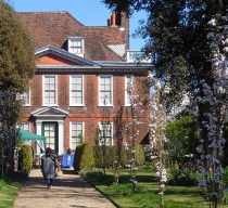 At present (April 2021), visitors cannot enter the house, but are able to see the small but lovely gardens. The rear gardens are on two levels, the lower of these includes a small orchard. The upper level is a lawn surrounded by flower beds. At one end of the lawn, there is a sculpture of a standing figure holding a long, slender staff in his right hand and dressed in what looks like 18th century attire.