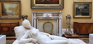 In one small gallery, which contains a sculpture of a reclining nude, two paintings hang close to each other but are separated by a neo-classical fireplace (an exhibit). One of them is by JMW Turner (1775-1851) and the other by his contemporary rival J Constable (1776-1837). It is interesting to see them almost side-by-side because it allows the viewer to compare their styles and what they try to convey in their paintings. The Turner painting depicts “The Falls of the Clyde”, and the Constable depicts “Cottage at Bergholt”. Neither of the paintings, both created in the age before photography, achieves the accuracy of, say, a photograph; both seem impressionistic, but the effects that the artists were attempting to have on the viewer are entirely different.