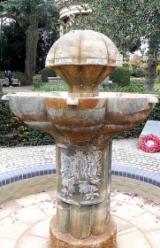 The other monument was unveiled in 1968, 50 years after the formation of Czechoslovakia out of the ruins of the failed Austro-Hungarian Empire. The memorial is in the form of a circular fountain. A bowl is supported by a single pillar on which the heraldic emblem of Czechoslovakia can be seen in bas-relief. Something, which at first sight resembles a large mushroom, sprouts upwards from the centre of the bowl. Closer examination of this reveals that it is a sculpture depicting a cluster of open parachutes. On each parachute, there is a name of one of the group of volunteers who parachuted into Czechoslovakia. The monument was designed by John French.