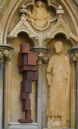 The sculptor Antony Gornley (born 1950) has added a new artwork (made of metal) to an empty niche on the west facade of Wells Cathedral in Somerset, England