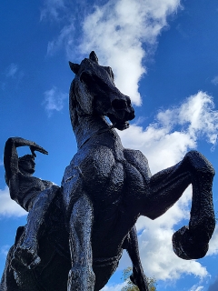 CAST IN BRONZE, he sits aside a rearing horse. He looks west towards Kensington Palace and uses his right hand to shield his eyes from the setting sun. I am describing a cast of a sculpture by George Frederic Watts (1817-1904), which bears the name “Physical Energy”. The sculptor was born on the birthday of the conductor George Frederic Handel – hence his two first names.