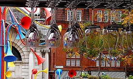 CLOSE TO SELFRIDGES, there is a less well-known attraction for Londoners and visitors to London. We visited it today, the 7th of October 2021, for the first time since we last went there in March 2017. Back then, I wrote about the place and posted my piece, reproduced below, on a travel website. When we went there today, we found an attractive temporary art installation, “Sonic Bloom” by the artist Yuri Suzuki (born 1980). This colourful and imaginative artwork is supposed to emit sounds, but when we visited it was silent. The café that we saw when we went to the place, Brown Hart Gardens, has been replaced by a new one run by a Sicilian. Far from offering the usual café fare, this decorative, stylish eatery serves pizzas, lasagnes, burratas, caviar, champagne, as well as coffee.