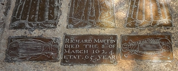 So much for the lost brasses. Fortunately, at the eastern end of the church, several monumental brasses have remained in place – some of them intact, and others damaged. To the south of the high altar, there is a set of intact 17th century brasses commemorating members of the large Martyn family. Included amongst these brasses are two of particular interest – they are Chrism brasses (see photograph above), which commemorate children who died before their mother was “churched” (that is before the mother has gone to church to give thanks to God for the birth of a child). The Chrism brasses depict babies in swaddling clothes. In addition to these brasses, there is another one depicts a brother and sister. The girl is holding a skull, which means that she died before her parents.