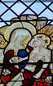 The Pietà image in the surviving mediaeval stained-glass is just one of many interesting things that can be seen in the magnificent, large parish church at Long Melford. As the Michelin Guidebooks often say, the place is “worth a detour”.