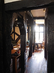 The entrance to The Boston Tea Party is via a shop beneath a building that looks newer than the older looking half-timbered edifice straddling the passageway mentioned above. A staircase leads to a dining area above the shop, which is where we enjoyed breakfast one morning in March 2022. This room has a decoratively patterned plaster ceiling and the remains of an old inscription in gothic script. As we were leaving, I saw a notice that advised customers that if the section, where we ate, was closed, customers should proceed up to the ‘Great Hall’. I was intrigued.