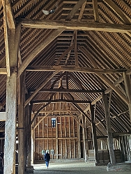 IF WE HAD NOT MISSED a turning at a road junction in Essex, we might never have visited Prior Hall Barn (near Widdington). Maintained by English Heritage, this well-preserved, huge timber-framed, wood-cladded 15th century barn. Constructed entirely of timber – without any metal, it has been estimated that its 900 pieces of timber were derived from 400 trees. Some metal structural elements have been added since the barn’s original construction, which judging by the date of the timbers commenced no later than about 1472. It remained in use as a barn until 1976.
