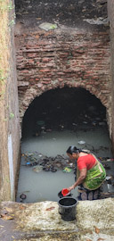 The lady picked up one of the bucket on the step beside the water, and filled it from the well. Then, she began dowsing herself with the water. Fully dressed, she poured several buckets of the unwholesome looking water over her whole body.