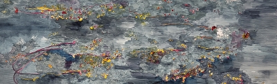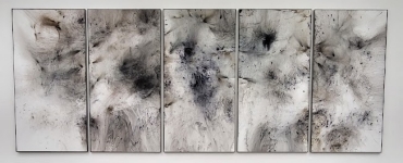 The unpredictability of the explosive material adds an interesting chance element to the finished product, but despite this, the composition was initially planned by the artist. In some of the works on display, not only was gunpowder placed on the base (i.e., paper, glass, etc) but also pigment powders. The explosions caused by igniting the gunpowder cause interesting spreading and scattering of the pigment.