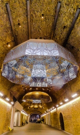 One of these was the Stainer Street Walkway that links St Thomas Street and Tooley Street and passes through the station’s foyer from which stairways lead up to platforms. This wide passageway lined with ochre coloured brickwork is now well-lit and apart from being a bit chilly, quite pleasant. But look up, and you will see three enormous, reflective, decorative umbrellas suspended from the ceiling. Each umbrella is decorated with geometric symbols and lettering. The lettering forms sets of words that are supposed to be meaningful for those who bother to read them.